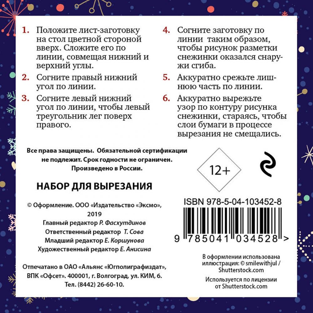Пусть этот маленький набор бумажных снежинок станет первым шагом в подготовке к Новому Году! Украсьте ими окно, зеркало, елку, открытку, используйте для сервировки праздничного стола или в качестве дополнения к упаковке новогоднего подарка. В комплекте вы найдете восемь цветных листов-заготовок с уже нанесенной разметкой контура для вырезания ажурных снежинок. Вам нужно всего лишь сложить лист-заготовку по приведенной на упаковке схеме и затем вырезать ножницами снежинку по линиям.