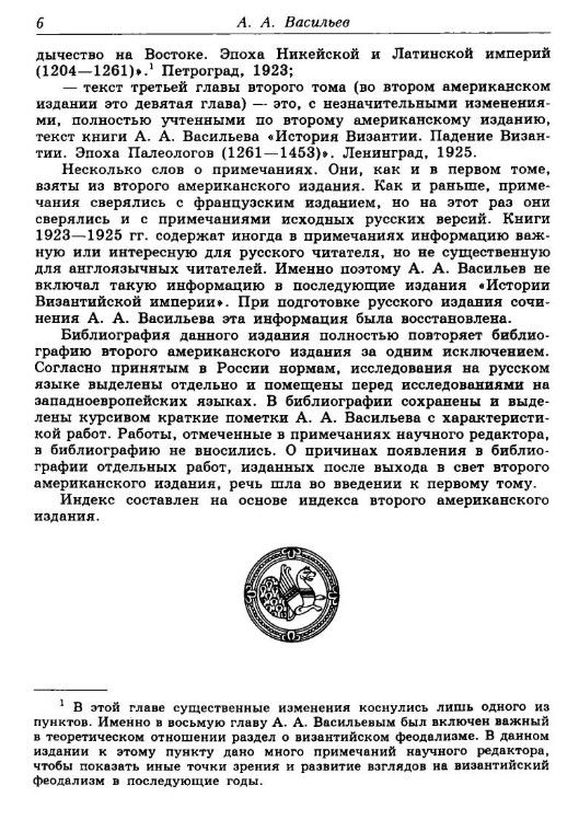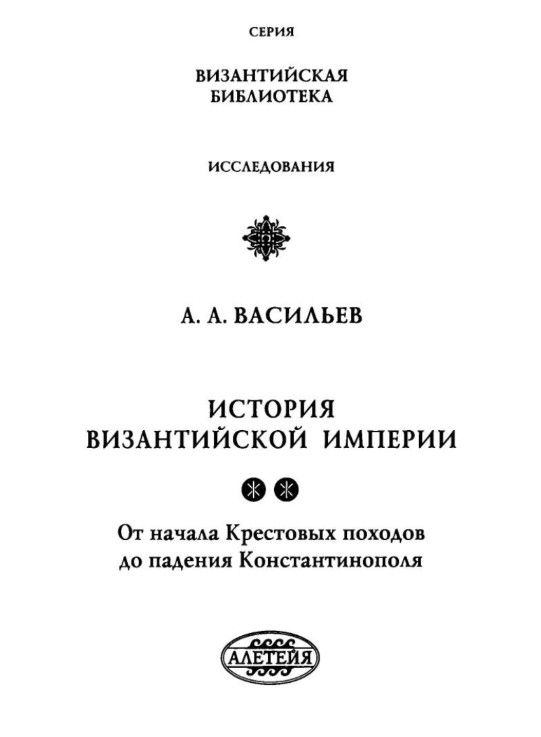 В научном наследии выдающегося русского византиниста и арабиста А. А. Васильева (1867-1953) особое место занимают работы общего плана, охватывающие всю историю Византии вплоть до падения Константинополя в 1453 году. На русском языке в первой четверти XX века в Петрограде — Петербурге — Ленинграде вышли следующие его работы: 1) Лекции по истории Византии. Время до Крестовых походов (до 1081 года); 2) История Византии и крестоносцы. Эпоха Комнинов (1081-1184) и Ангелов (1185-1204); 3) История Византии. Латинское владычество на Востоке. Эпоха Никейской и Латинской империй (1204-1261); 4) История Византии. Падение Византии. Эпоха Палеологов (1261-1453).