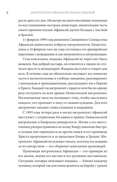 В новой книге митрополита Афанасия Лимасольского – ответы на вопросы современного христианина: о жизни со Христом, семье и отношениях с ближними, работе и Промысле Божием о каждом человеке. В проповедях владыки Афанасия – опыт христианина, касающийся сердца каждого из нас, совет его, простой и понятный, но исполненный духовной мудрости.