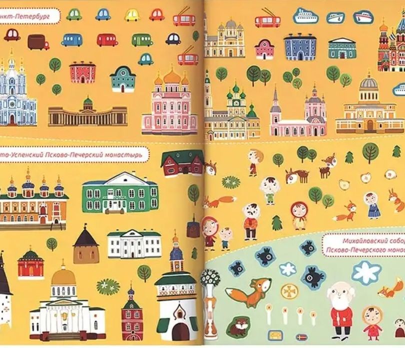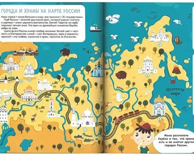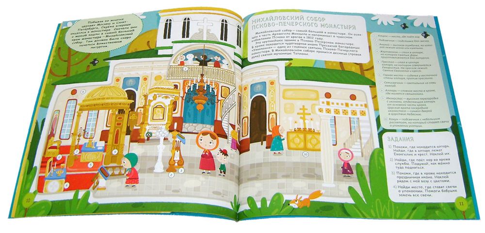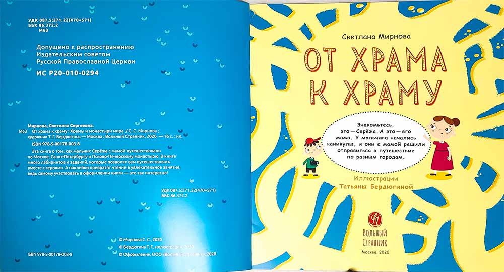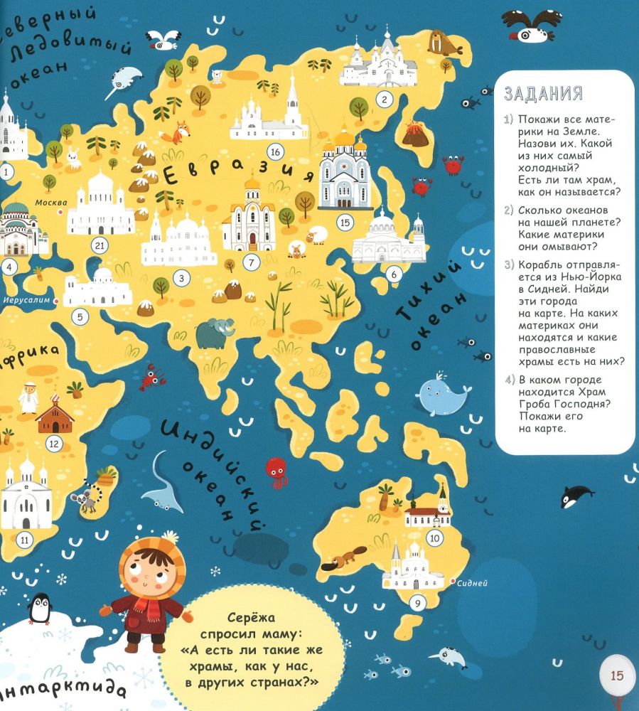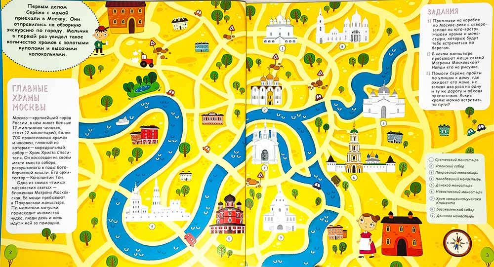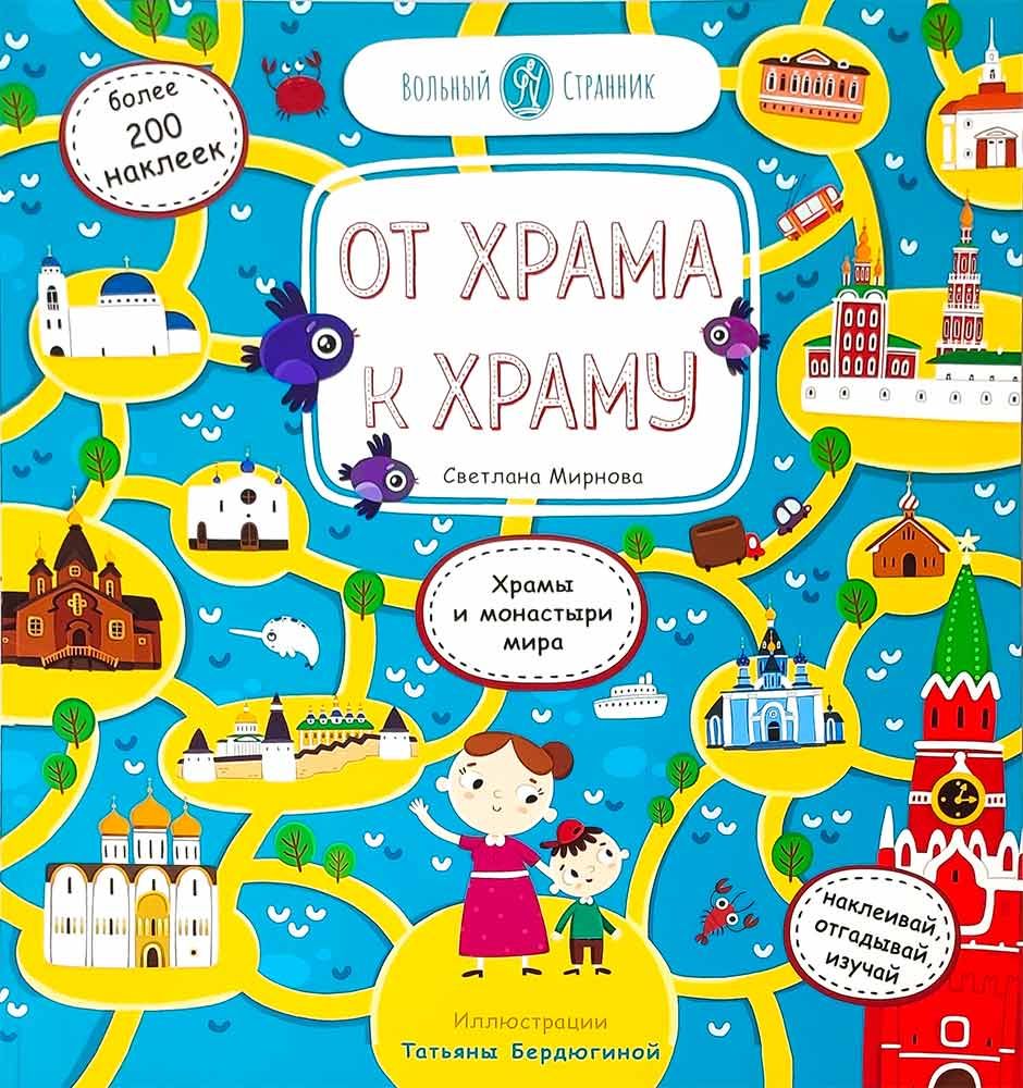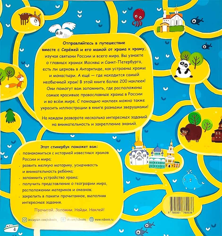 Отправляйтесь в путешествие вместе с Серёжей и его мамой от храма к храму, изучая святыни России и всего мира. Вы узнаете о главных храмах Москвы и Санкт-Петербурга, есть ли церковь в Антарктиде, как устроены храмы и монастыри. А ещё — где находится самый необычный храм! В этой книге более 200 наклеек! Они помогут вам запомнить, где расположены самые красивые православные храмы в России и во всём мире. С помощью наклеек можно также украсить иллюстрации в книге разными зверушками! На каждом развороте несколько интересных заданий на внимательность и закрепление знаний.