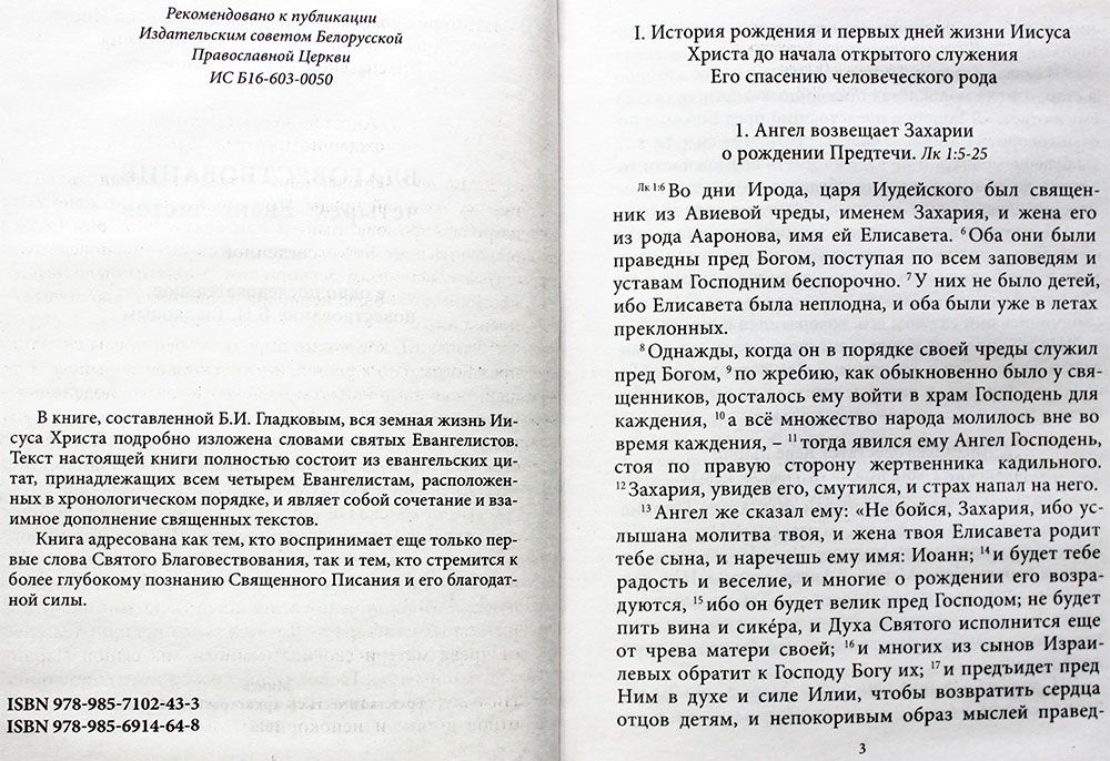 В книге "Благовествование четырех Евангелистов, сведенное в одно последовательное повествование", составленной Борисом Ильичем Гладковым, вся земная жизнь Иисуса Христа подробно изложена словами святых Евангелистов. Текст настоящей книги полностью состоит из евангельских цитат, принадлежащих всем четырем Евангелистам, расположенных в хронологическом порядке, и являет собой сочетание и взаимное дополнение священных текстов.