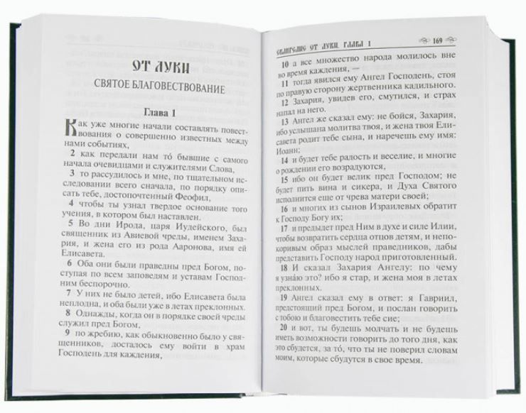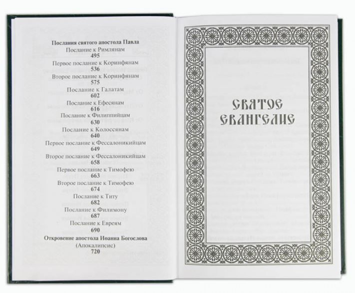 Очень хорошее издание Нового Завета в традиционном Синодальном Переводе стандартного (обычного) книжного формата. Крупный шрифт. Офсетная белая бумага. Каждая книга с новой страницы. Каждый стих с новой строки. Буквицы в начале каждой главы. Прочная строгая обложка тёмно-зелёная бумвиниловая с тиснением фольгой. Вшитая белая (под цвет капталов) закладка-ленточка (ляссе). Даже при ежедневном чтении - хватит надолго.