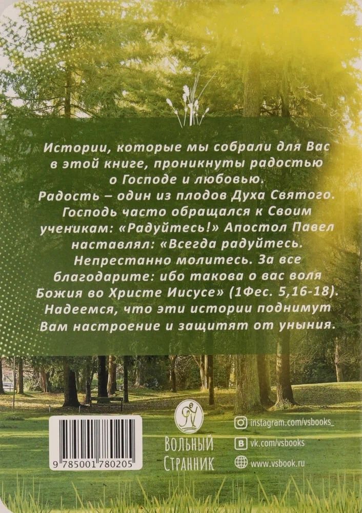 Истории, которые мы собрали для Вас в этой книге, проникнуты радостью о Господе и любовью. Радость — один из плодов Духа Святого. Господь часто обращался к Своим ученикам: «Радуйтесь!» Апостол Павел наставлял: «Всегда радуйтесь. Непрестанно молитесь. За все благодарите: ибо такова о вас воля Божия во Христе Иисусе» (1Фес. 5,16-18). Надеемся, что эти истории поднимут Вам настроение и защитят от уныния.