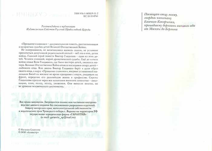 «Прощание славянки» — документальная повесть известной православной писательницы Наталии Сухининой. Она рассказывает о непростых судьбах детей Великой Отечественной войны. Не наигравшиеся, не начитавшиеся вдоволь сказок, не успевшие пресытиться родительской опекой и лаской… Главный герой повести Виктор Гладышев — один из этих детей. Ещё до начала войны семья Вити Гладышева, где было шестеро детей, лишилась матери. А война отняла последнюю опору детей — любимого отца. Всю жизнь Виктор Гладышев берёг в душе образ своего отца, а марш «Прощание славянки», впервые услышанный маленьким Витей на вокзале во время прощания с отцом, уходившим на фронт, определил его дальнейшую жизнь и профессию. Сироты Гладышевы прошли через все испытания военного лихолетья — оккупацию, плен, голод, холод, унижения. Они вынесли многое, но не уронили человеческого достоинства.