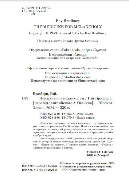Главная / Книги / Художественная литература. Биографии. Мемуары. Интервью / Брэдбери Р. Лекарство от меланхолии (2021, pocket-book)